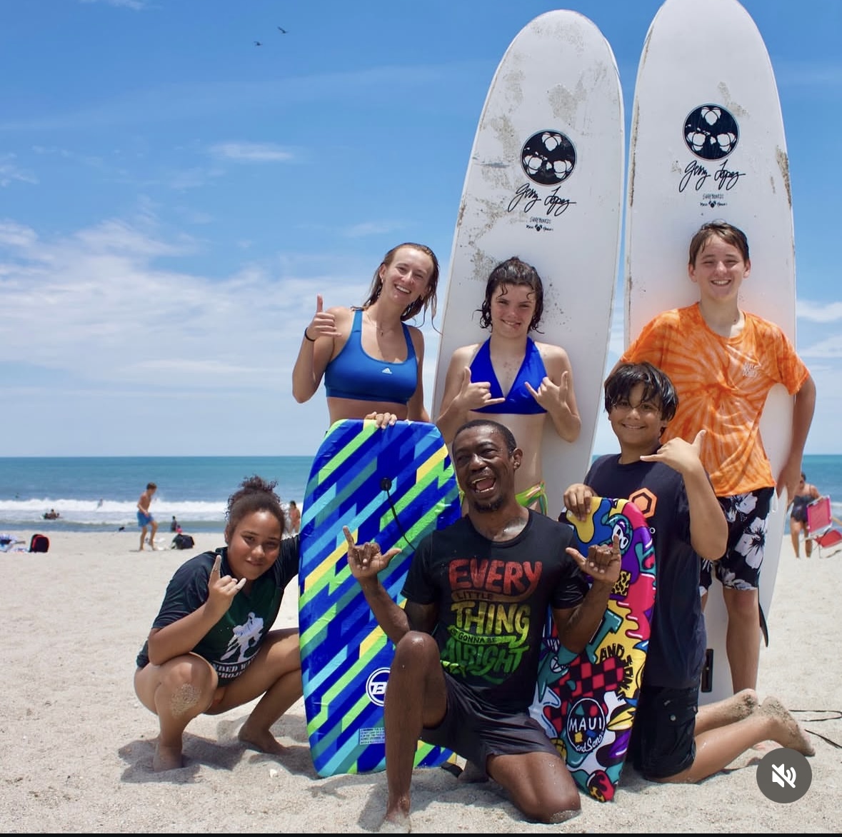 After that first day of kayak instruction on the lake, the group soon graduated to bigger water. They developed confidence navigating wind and waves, overcame jitters, and reached barrier islands where they swam, collected shark teeth, and learned about the natural history of the region. Still, the highlight of the summer for nearly every participant was the Beach Day—the precious hours spent catching waves under the careful watch of Brad Turner, ALL in the Water co-founder and dedicated volunteer.